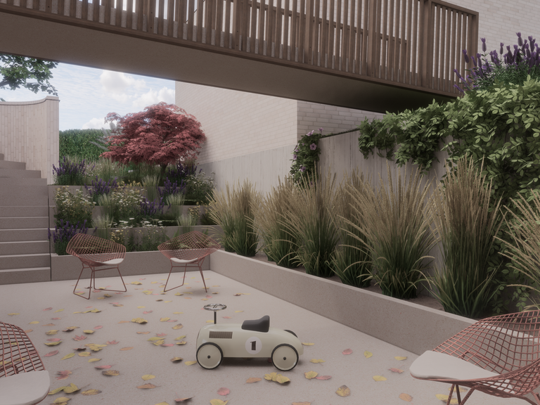 Design for a new single-family home in the hills of the Flemish Ardennes. Thanks to the steep plot, we have been able to create a very discreet horizontal facade. At the garden side, the house extends over two floors with large windows offering views over the valley. To bring daylight into the ground floor, we work with a large patio along which a walkway runs. This bridge forms the monumental entrance of the house.