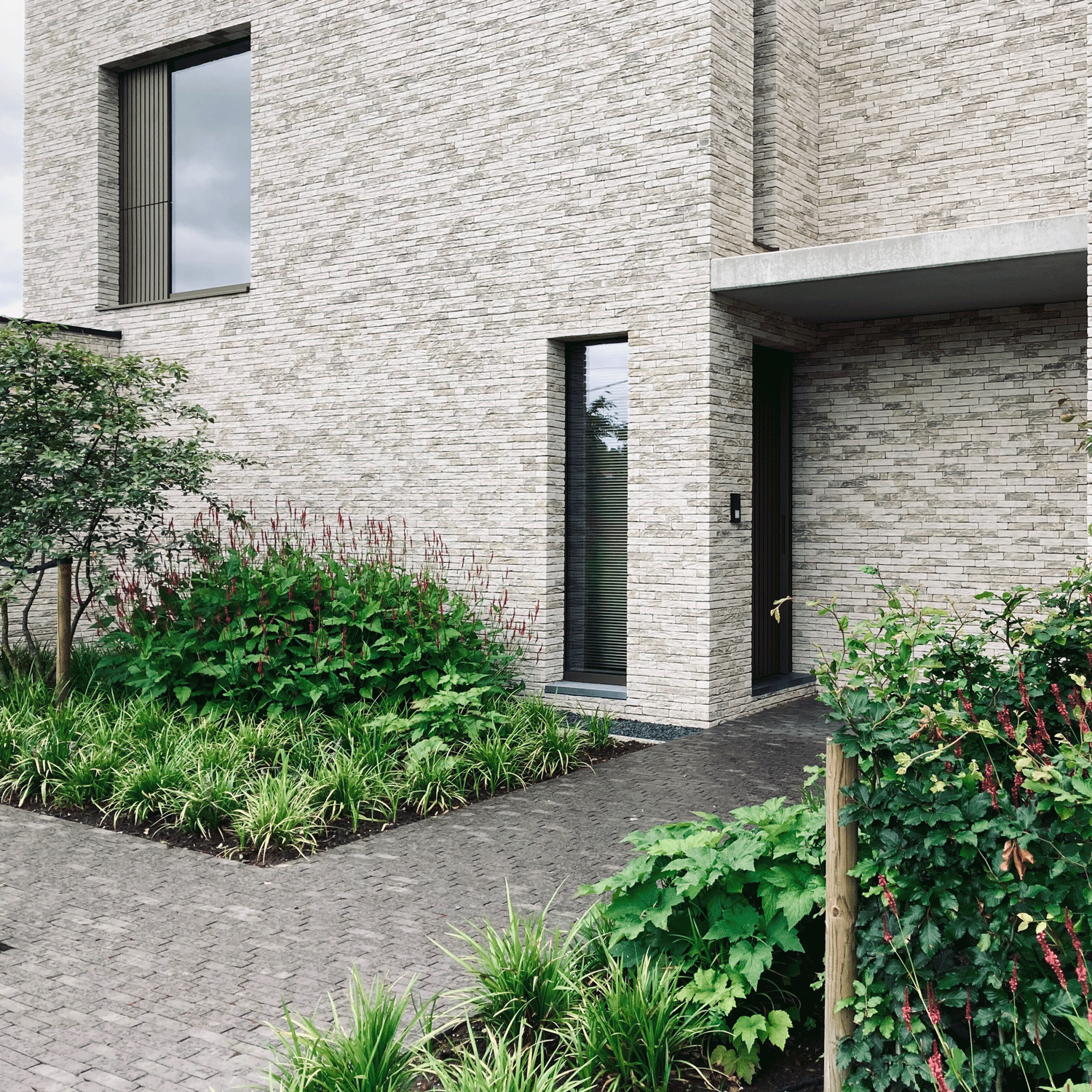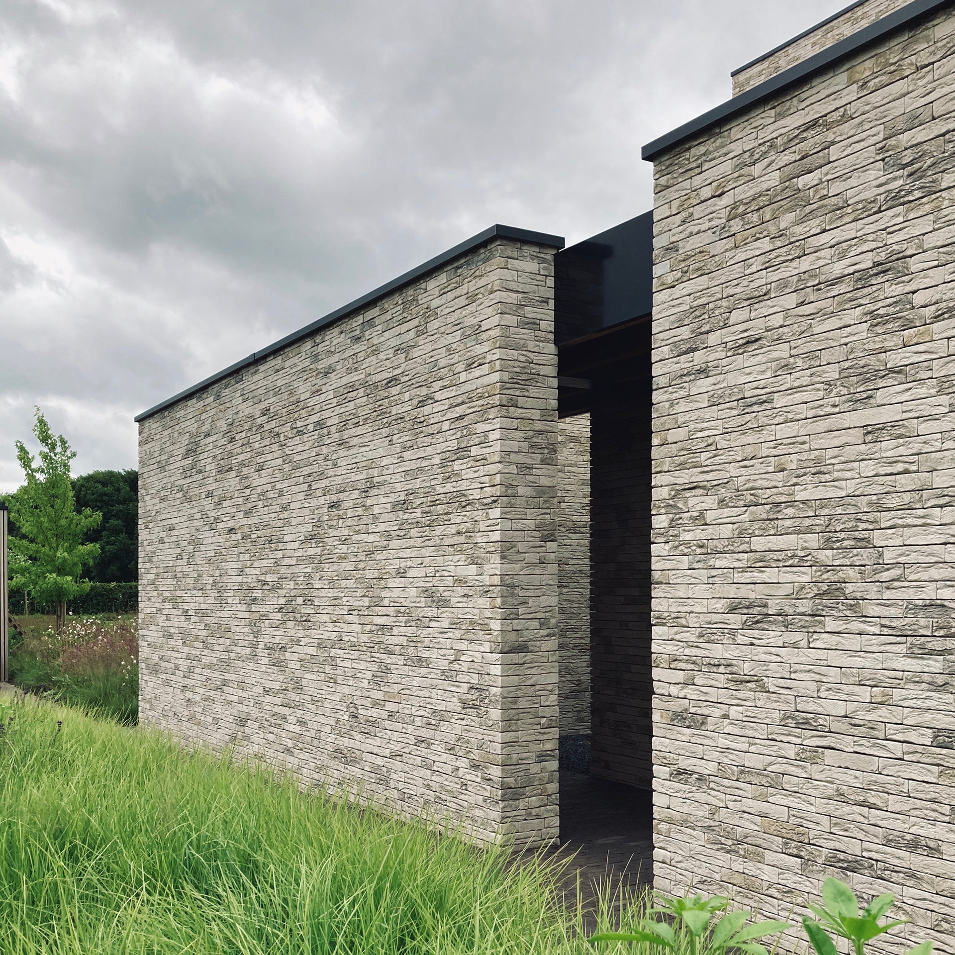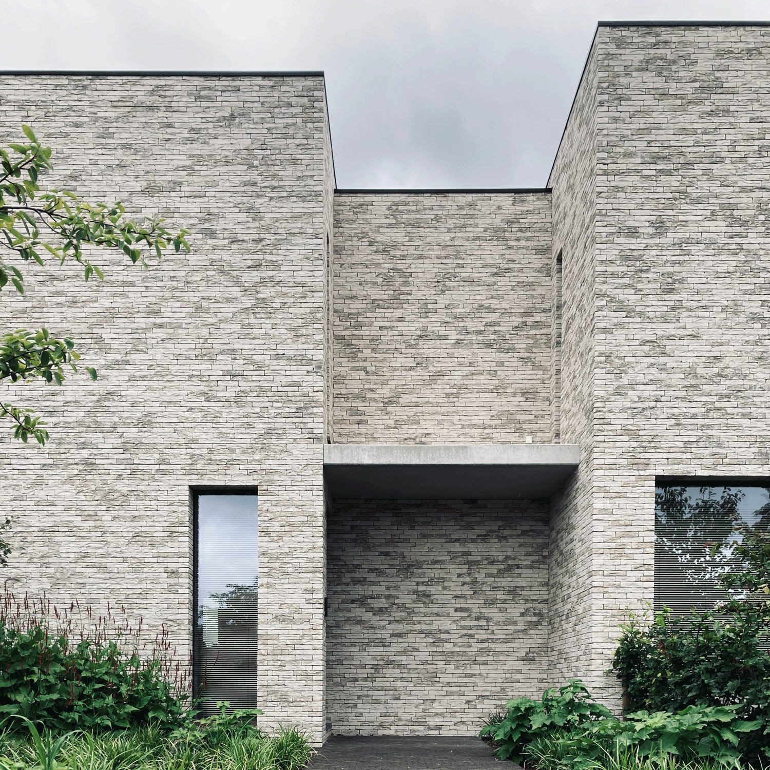 This house has a closed front facade to guarantee the privacy. At the back the house has a double level high window to maximize the contact with the garden. This glass volume connects the two stone volumes and forms the heart of the house. The bridge at the vide in this glass part of the house connects the rooms of the kids with the master bedroom.
