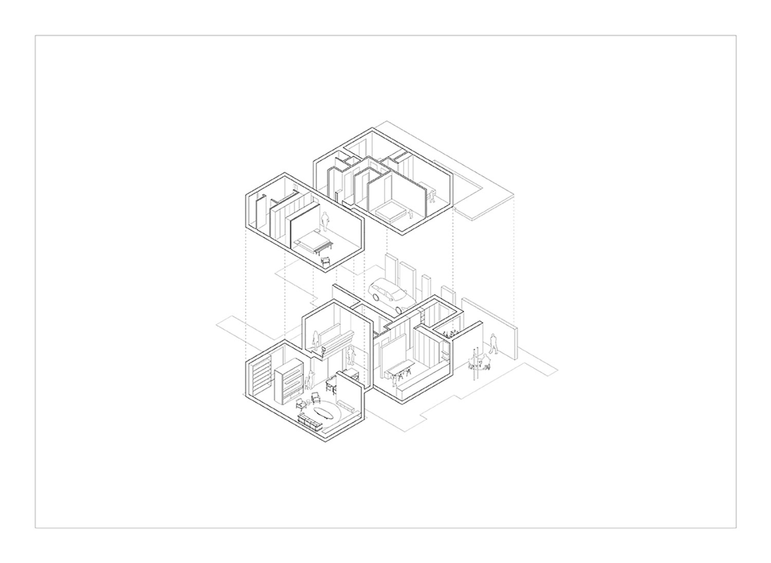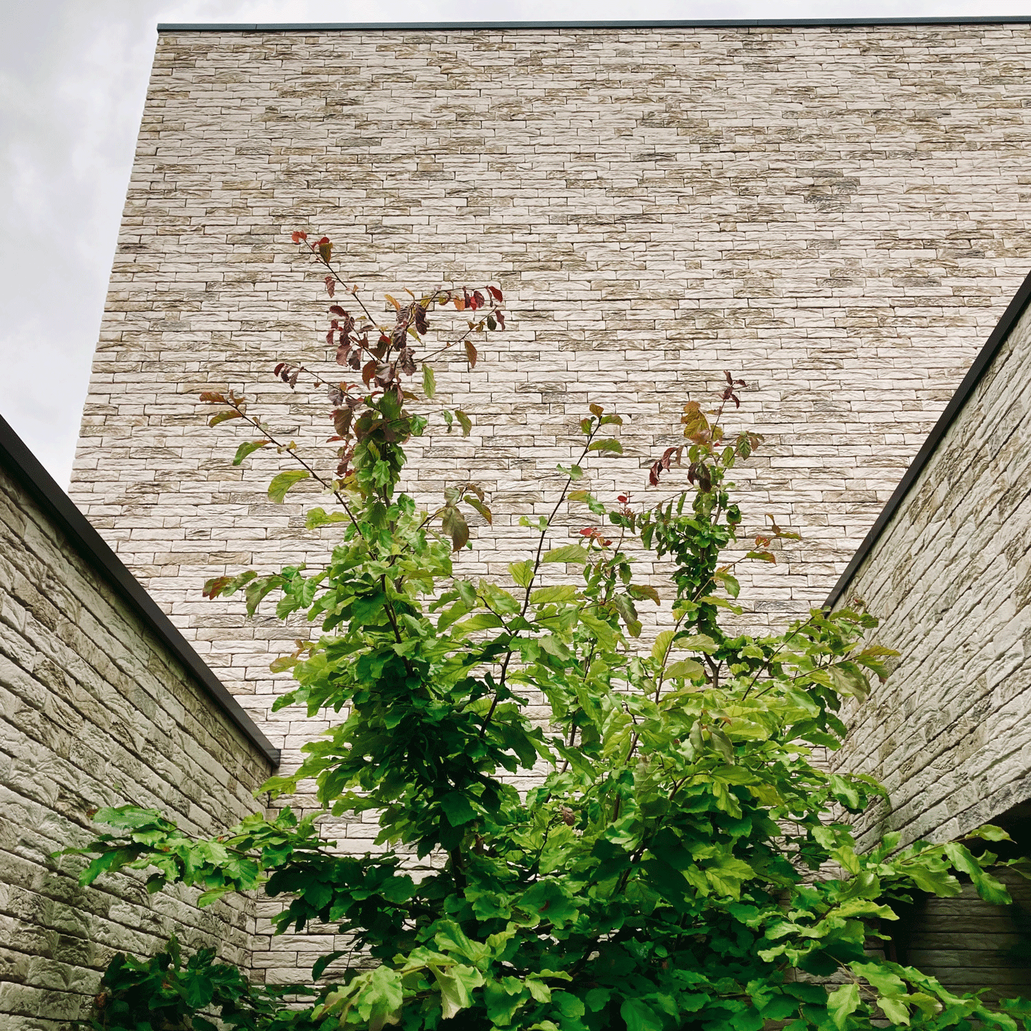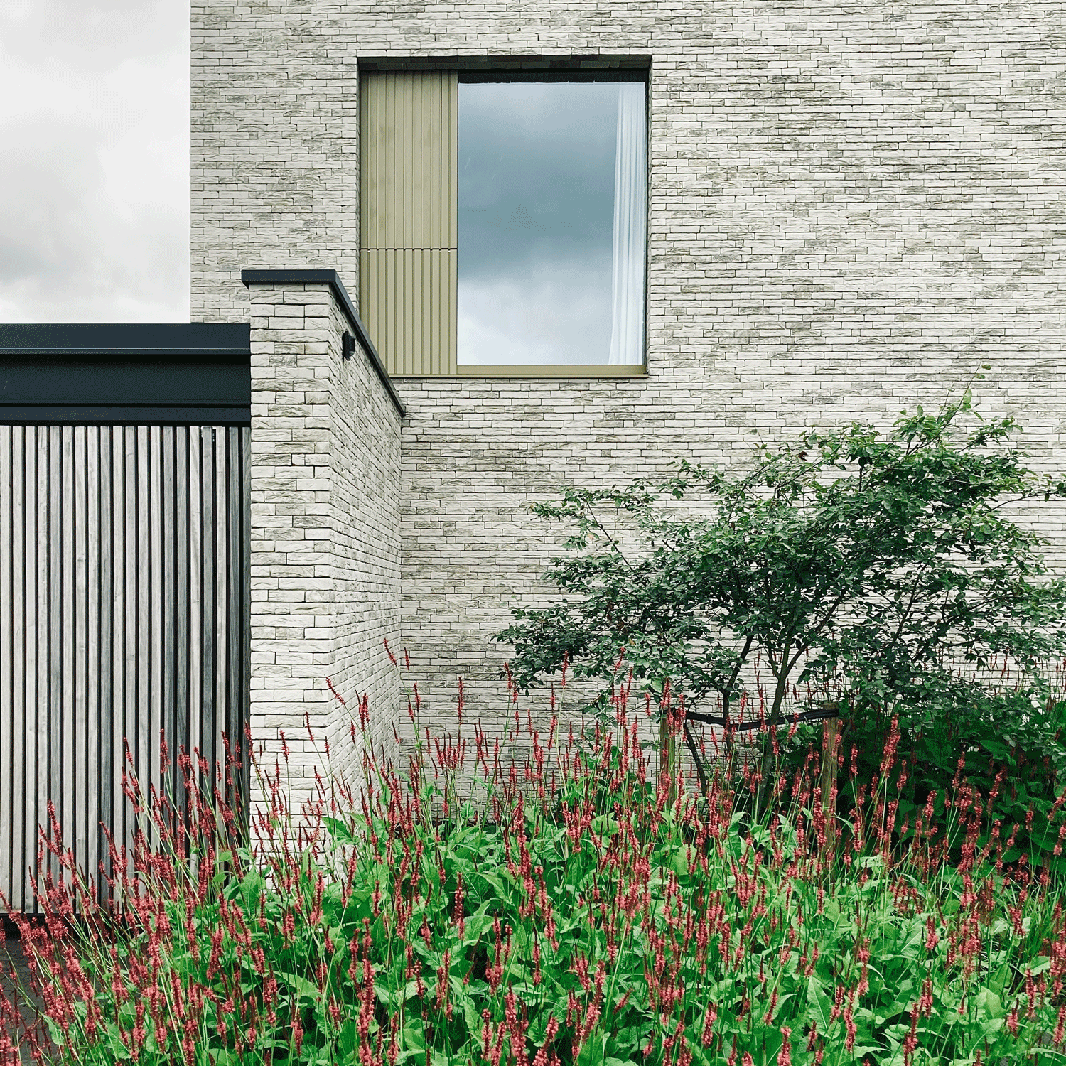 This house has a closed front facade to guarantee the privacy. At the back the house has a double level high window to maximize the contact with the garden. This glass volume connects the two stone volumes and forms the heart of the house. The bridge at the vide in this glass part of the house connects the rooms of the kids with the master bedroom.