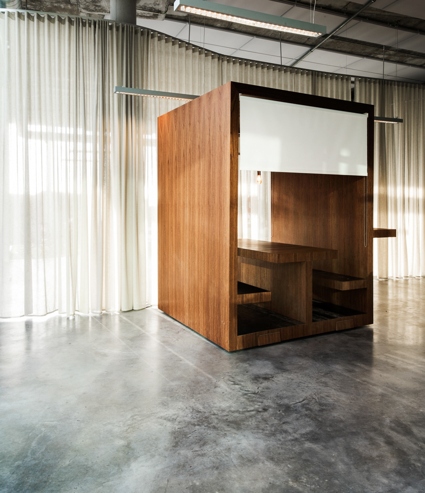 The curtains provide necessary direction as well as visual separation between the offices and the kitchen, dining area, relaxation space, and the arena.