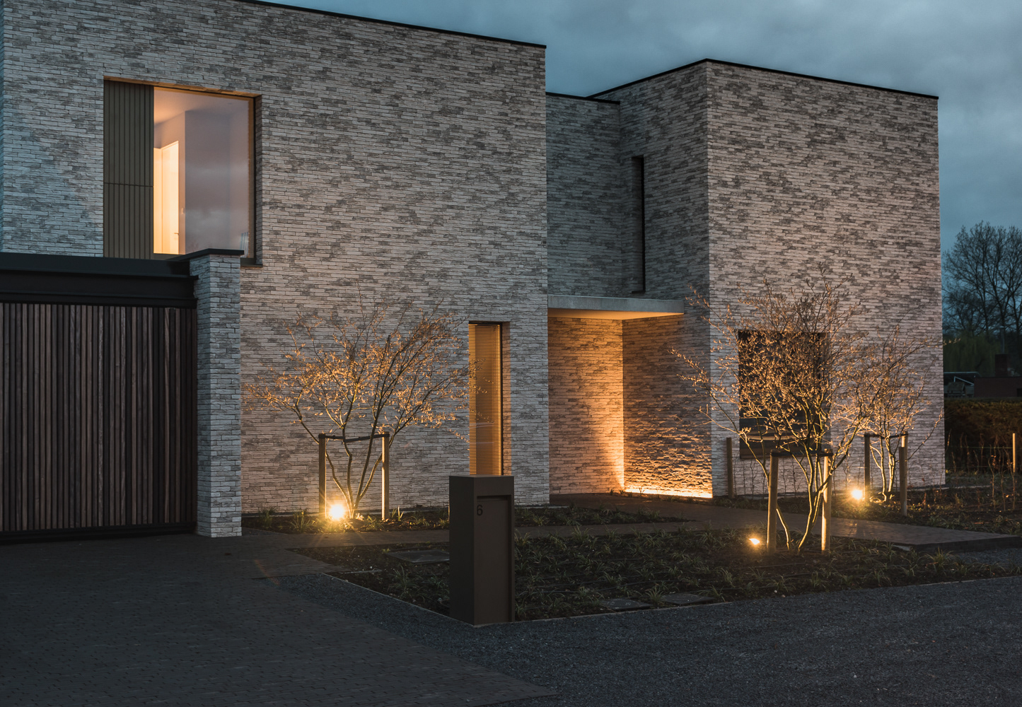 De woning bestaat uit twee massieve volumes die in verbinding staan met elkaar door een lager en transparanter volume dat gekenmerkt wordt door zijn imposant schuifraam over gans de hoogte van de vide.