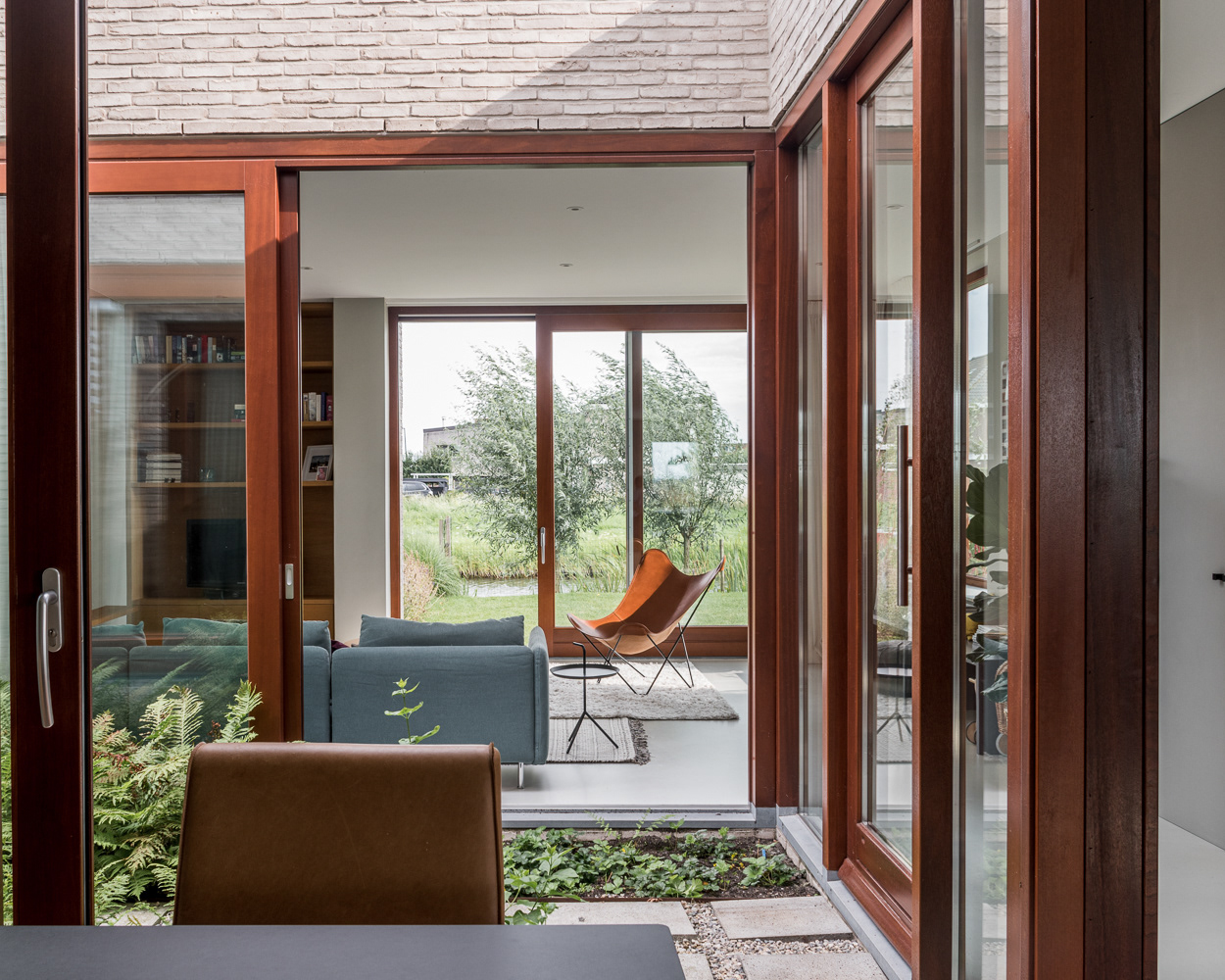 Door het relatief smalle perceel, de noodzaak aan licht en door de wens om buiten naar binnen door te laten lopen werd er een patio geïntegreerd in het center van de woning.